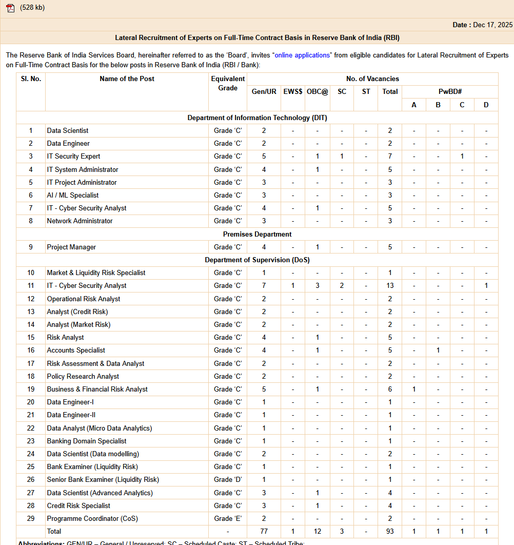 Reserve Bank of India has opened lateral recruitment for Experts on a full-time contract basis across multiple departments (IT, Supervision, Risk, Data Science, Cyber, and related functions). There are around 93 positions, offered for an initial 3-year contract (extendable).